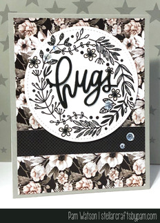 The fourth card I utilized a floral stamped image again, the hugs die, and the patterned papers.